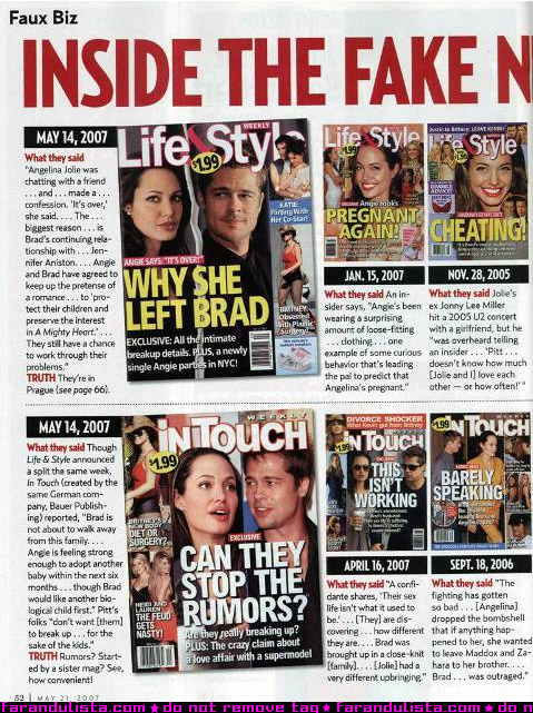 Yo sigo creyendo que estos rumores son solo para vender revistas, es super curioso saber todo, si lees en una portada que Brad y Angie estan peleando. Es más, siempre son las mismas revistas las que dan los titulares, Life&Style e inTouch. Cada vez que la pareja está de bajo perfil, como ahora, sale alguna noticia sobre ellos, que si Brad llevó a Jen a conocer a Shiloh, que si Brad y Angelina se separan, Que si Jen vendió su parte de la Historia… Blah Blah blah! Para que vean que no es mentira aquí hay un artículo que informa cuantas veces estas revistas han hecho sus portadas con titulares que tienen que ver con Brangelina. Y ya está bueno de siempre meter a Jennifer Aniston en el medio. Ya ha pasado mucho tiempo, y cada quien está por su lado, Brad dejó a Jen por Angie, por qué querría volver con ella ahora? Y de verdad después de semejante escándalo y bochorno, Jennifer volvería con Brad? Yo, ni que me pagaran! I don't think so, I believe all these rumors are on purpose to sell tabloids. Always the same magazines are publishing about Brangelina, Life&Style and inTouch. When Brangelina is low key the magazines publish any rumor about the couple, the secret wedding, the break-up, the secret meeting between brad and Jen… blah, blah, blah. Here you can see an interesting article on Inside the fake news hoax. Read it, It's really funny to realize that all these rumors are crap.