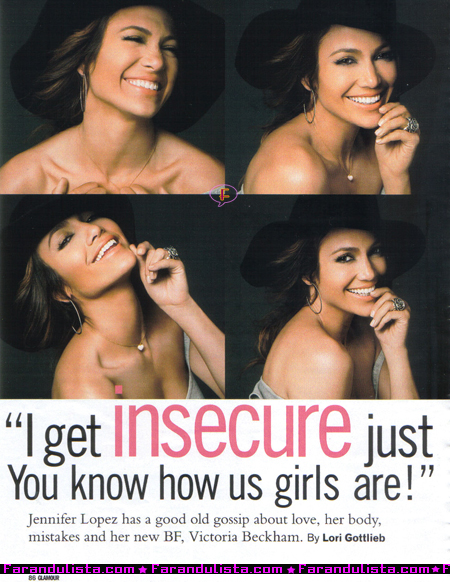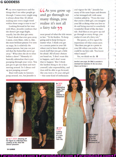 Jennifer Lopez nuevamente muestra su conocido rostro en la portada de en una revista, esta vez en la versión Británica de Glamour, en su edición de Octubre. En la revista se pueden apreciar varias fotos de Jennifer Lopez, en la cual luce muy fresca y alegre (será su embarazo?) también se pueden apreciar sus distintos estilos a lo largo de los años. En la entrevista con Glamour (UK) Jennifer habla de sus errores, su cuerpo, un muy buen chisme amoroso pasado y su nueva amistad con la Posh Victoria Beckham. También la Jlo confiesa sentirse insegura igual que todas las mujeres. Sobre sus hábitos alimenticios, dice llevar una dieta y no ser de esas personas que comen "comida chatarra", pero su perdición son las galletas con chispas de chocolate y la leche descremada.
