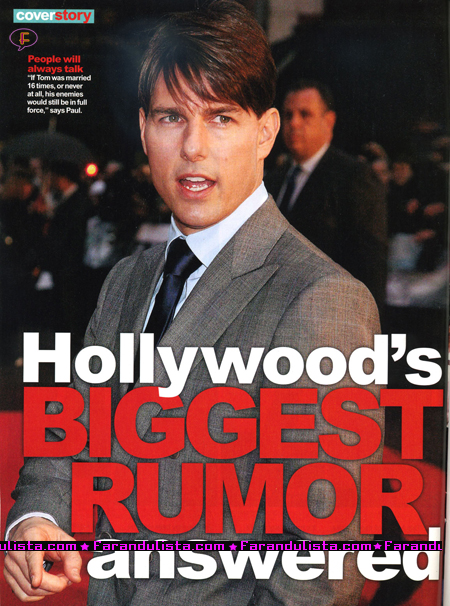 Uno de los rumores más grandes en Hollywood es sobre la sexualidad de Tom Cruise. Desde que yo recuerdo comentan que Tom es gay. La revista In Touch ha revelado la respuesta a estos rumores que han rodeado la vida del actor por años, en lo que denominan en su portada: Exclusivo. Los rumores de que es gay, Finalmente la verdad (Exclusive. The gay Rumors, Finally The Truth) colocando de fondo una foto de Tomkat. El reportaje de la revista In Touch es sobre una ex extrella del cine para adultos convertido en Detective privado (parece guión de película mala) quien ha hecho una exhaustiva investigación y ha descubierto que todo apunta a que Tom Cruise siempre ha sido … Heterosexual.