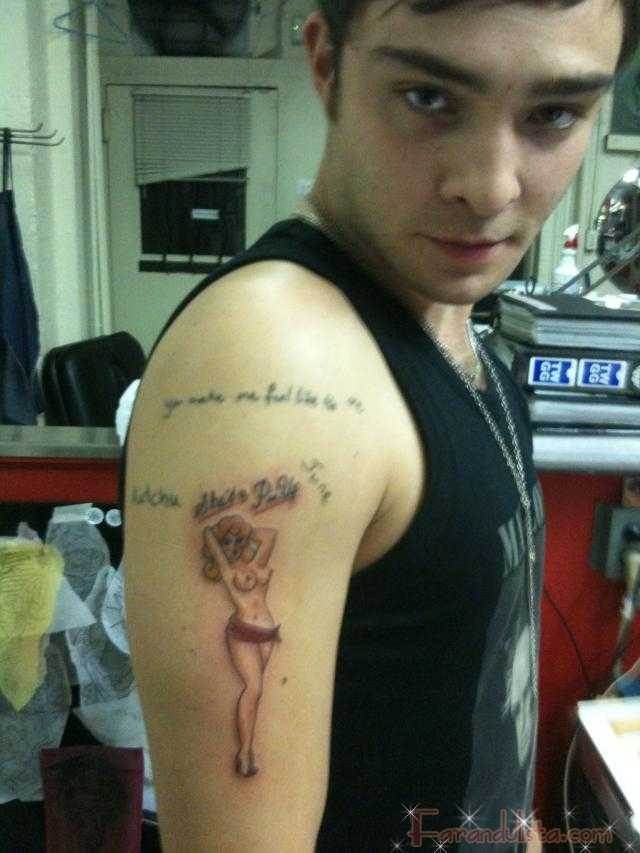 El Gossip Girl, Ed Westwick se ha hecho dos nuevos tatuajes, ok, eso no es gran cosa, pero tienen que ver qué se tatuó. Se ha tatuado una pluma (?) y una chica pin-up… Obvio el tema de los tatuajes es personal, y cada quien hace con su cuerpo lo que quiera… pero, en serio, se va a arrepentir. Parece que ese dia despertó y dijo: Heyy me tatuaré algo… lo que sea! It’s funny, encima de la chica dice She’s a pin-up… you make me feel like… Anyway, si está bien tatuado/dibujado no debería explicarlo, right? Creo que Kat Von D estaba ocupada ese dia LOL!