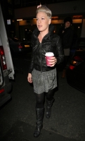 Pink fue fotografiada muy temprano en la mañana a su llegada a los Estudios de Radio 1 en Londres, UK (11/12) no faltó su taza vaso de café para levantar esos ánimos. Pink luce muy bien para ser tan temprano.