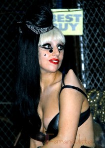 Lady Gaga estuvo en ‘Best Buy’ store en New York promocionando y firmando su tan anticipado nuevo album ‘Born This Way’, como ella nació así, you know, se apareció vestida con lo primero que encontró, dijo: Heyy esto es muy original, voy a colocarme unas deformidades aquí en los hombros, para ser más original que nadie (quién tiene eso en los hombros? Ha!) me maquillo cual Halloween (que parezca que se me cayó todo el maquillaje y formó una legaña gigante y negra) y me pongo este traje de cadenas, que me tape mi cosa, este top con pechos caídos y me veré super cool… aah no olviden el lunar diamante. WRONG!!! WTF?? Qué le pasa a la Madre Monster? En su afán de parecer original está cayendo en lo absurdo… aaah, right! Ese es el punto, I got it!