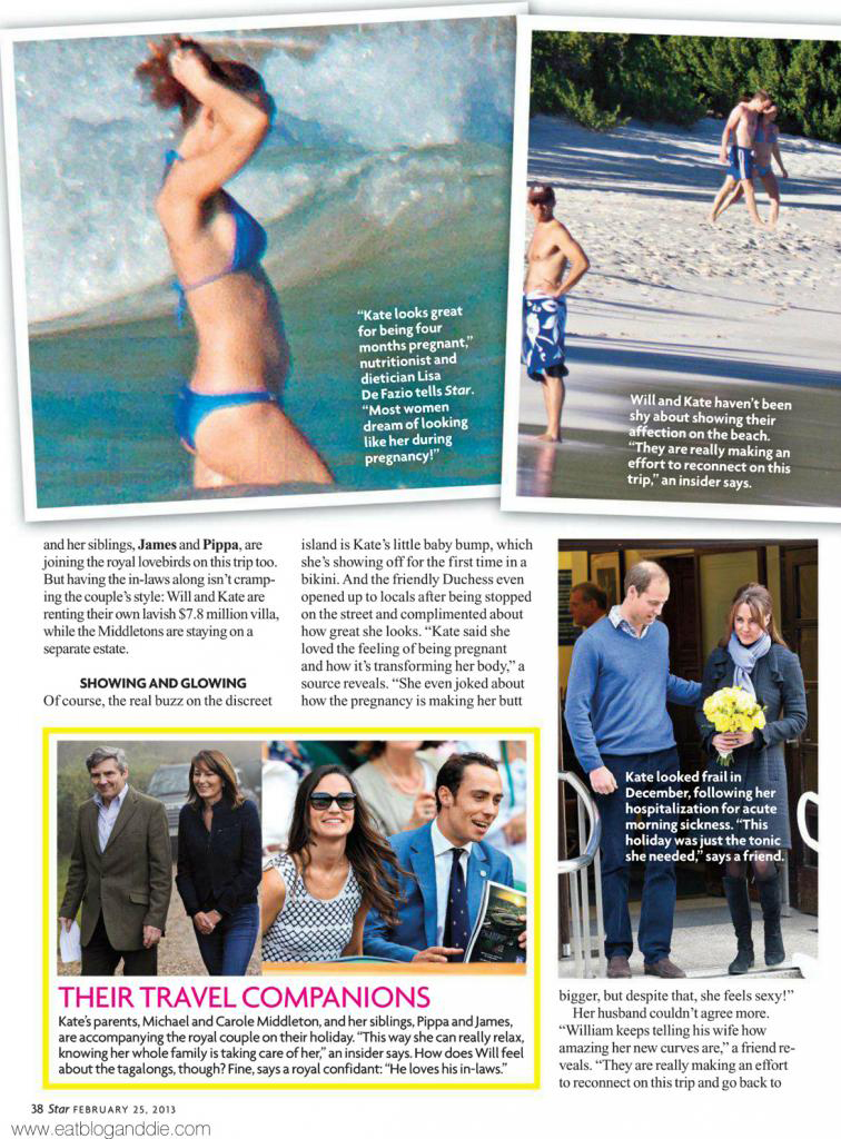 Ok, el titular no es ‘muestra su baby bump’. Le espiaron la Baby Bump a Kate Middleton mientras estaba de vacaciones en el Caribe. Star magazine publicó las pics de la revista italiana Chi, donde se ve a la Duquesa de Cambridge en bikini, con 4 meses de embarazo. Extrañamente, viniendo de Star, la panza parece editada, noten el borde de todas las fotos. Es gracioso que colocan ‘en una playa pública el 3 de Febrero’… y todas las fotos se ven borrosas, o sea, las tomaron desde muy pero muy lejos. Para agregarle más ‘emoción’ a las fotos, la revista agrega que hay ‘algo sorprendente sobre el embarazo que Kate le dijo a los locales’. Sure! Qué será eso? Obvio, ahora dicen, DICEN, que serán gemelos. You know, toda embarazada tendrá gemelos hasta que se demuestre lo contrario. Yo ni la reconocí, los cabellos… lol! Y la calva de William es lo que más llama la atención… baby bump? La mujer acababa de comer y le tomaron las pics…
