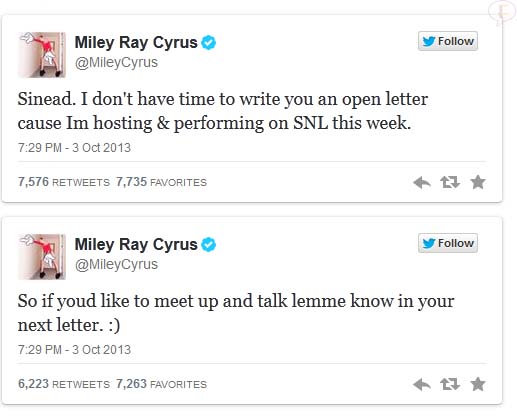 Luego de esto, Miley le escribió a Sinead vía Twitter: "Sinead. No tengo tiempo de escribirte una carta pública porque estoy presentándome y siendo anfitriona de SNL esta semana. Así que si quieres nos reunimos y hablamos, dímelo en tu próxima carta. : )"