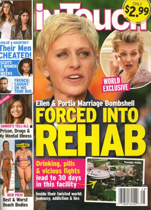 Resulta que Portia de Rossi fue "forzadamente" a rehab, "supuestamente" porque tiene problemas con la bebida y las pastillas. Además se la pasa peleando con Ellen. THE SAME STORY! Es el mismo cuento de siempre, pero esta vez con rehab de por medio, tratando de separarlas o hacer ver que ese matrimonio está muerto y próximo al divorcio. El tabloide dice dar un inside a ese mundo torcido de Ellen y Portia donde lo que hay es celos, adicciones y mentiras.
