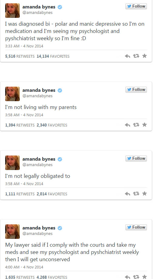 Amanda ha anunciado que fue diagnosticada bipolar y maníaco depresiva. La chica reveló su diagnóstico via Twitter este martes, dijo estar tomando sus medicamentos, estar yendo al psiquiatra y psicólogo todas las semanas y que está bien. "I’m fine!"
