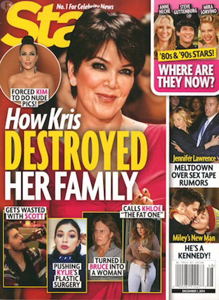 Esta semana tenemos la historia de como Kris Jenner (alias momager mother of Kim K) destruyó a su familia! La portada está bastante ingeniosa, tenemos a Kim Kardashian "forzada a hacer fotos desnuda!" Scott está bebiendo mucho. Kylie está siendo empujada a las cirugías plásticas, Bruce se está transformando en mujer, Khloe es la llamada "la Gorda". So, que le está haciendo Kris a todos? A Kim pues la esta copiando: siendo sexy, saliendo, va a clubes, usa su ropa. Kim quiere renunciar al reality show (SURE!). A Bruce, Kris lo está castrando." de alguna manera ella es la responsable por convertirlo en una mujer!" Sip, asi funciona, you know.