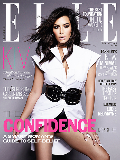 Confidence? Yeap, Kim Kardashian es la portada de la británica Elle magazine que habla de la confianza en sí misma… bahahahaha son tres portadas de la edición de enero 2015 (porque no le cabía el trasero en una sola) Nah! Son tres portadas fotografiadas por Jean-Baptiste Mondino y photoshopeadas… eso no lo dijeron. A Kim le borraron el trasero en las portadas, y las piernas también… En la primera portada Kim K sale comiendo la crema de un cupcake, sin trasero… porque Hello? El traserote de Paper magazine era de ella!! No fue editado, fue su trasero real… so? Aquí desapareció!