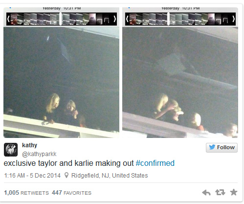 Well, well, tal parece que Taylor Swift y Karlie Kloss son más que amiguitas. Aparentemente, pillaron a las BFF besándose en un concierto Indie Rock ayer en la noche. WHAT? Sipis, Tay Tay y Karlie besándose. La foto la publicó una supuesta fan en Twitter, y se ve que está lejos de la pareja. Es una foto borrosa pero se ven a dos rubias Oh! Really? Y según dicen, son ellas!! CONFIRMADO!!! Taylor y Karlie estaban besándose.