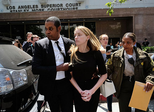 Dailymail tiene fotos de Amber llorando después de la audiencia, hoy viernes, se le ve la cara sin maquillaje y con un moretón – resultado del golpe con el celular el sábado pasado. Ella solicitaba la casa donde vivían, la Range Rover, los perritos Bristol y Boo, manutención conyugal y que Johnny pague los abogados. El juez le dejó vivir en la casa, y tiene la custodia compartida de uno de los perritos, no aprobó la solicitud de manutención conyugal.
