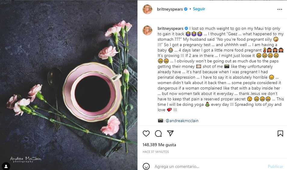 Britney en su post de Instagram dice que está esperando su tercer baby, dice más o menos esto, que perdió bastante peso para su viaje a Maui y que lo volvió a ganar, que ella pensó: “Geez qué le pasó a mi estómago??? Y su esposo (así le dice a Sam) le dijo que ‘No, que era que estaba preggo de comida’. Por lo que ella se hizo un test de embarazo y tendrá un bebé. Que 4 días después se ve más llenita porque ha comido y (su pancita) está creciendo. Ella dijo que no saldrá a que los paps le tomen fotos como antes, ella contó que sufrió depresión perinatal cuando estaba embarazada, que fue horrible pero que en aquella época nadie hablaba de eso, algunos lo consideraban peligroso si una mujer se quejaba con su bebé dentro, pero ahora las mujeres hablan de eso todos los días, gracias a Dios ya no hay que mantener el dolor reservado como un secreto. Que esta vez hará yoga todos los días.