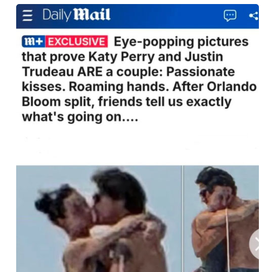 Aquí van algunos chismes del fin de semana… Katy Perry fue fotografiada muy romántica con Justin Trudeau. La cantante y el ex Primer Ministro de Canadá fueron captados besándose y abrazándose en un yate… DailyMail tiene las fotos (tomadas con una calculadora Casio desde la luna). Recuerdan que los vieron paseando juntos? Son parejita. – Yahoo!