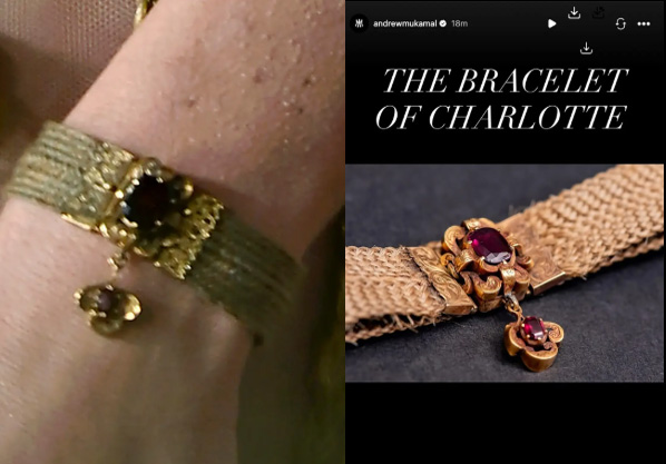 Se dice que Charlotte usaba la pulsera todos los días y ahora se encuentra en el Museo Brontë Parsonage. El vestido de Robbie casi quedó eclipsado por la notable pieza histórica en su muñeca.