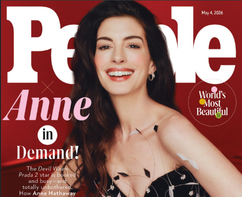 Anne Hathaway es la Más Hermosa de la revista People en su lista de las personas más bellas del mundo edición 2026, posando para la portada con un vestido de alta costura de Tamara Ralph con plumas en 3D.